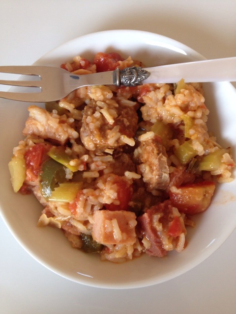 Something about Mardi Gras – or the fact that I received an enormous ham steak in my meat CSA – and I had jambalaya on my brain this week. A little New Orleans trinity of onions, celery and green peppers sauteeing on the stove, and I was on my way to making a big batch. Add to the trinity: your favorite cajun seasoning (usually a concoction of paprika, salt, garlic, sugar, oregano, cayenne and thyme), some diced tomatoes, rice, stock and cook away for about 15 minutes (or until rice is tender); finish with a little chopped ham, spicy sausage, and shrimp, if you’ve got ’em, and you’re in business!
