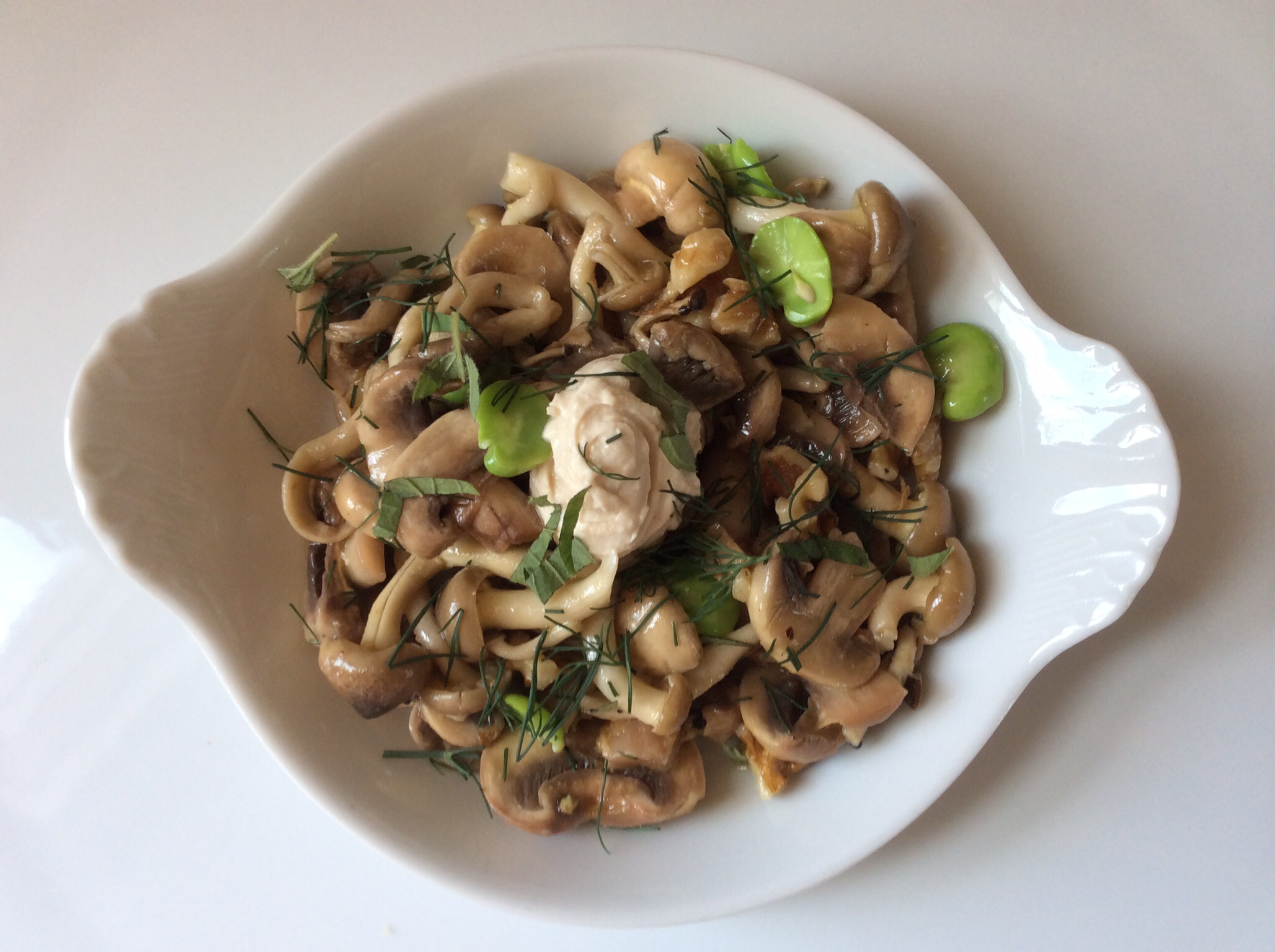 Here is a perfect summer mushroom plate. It is light & healthy and travels very well for lunch al fresco. It starts with a tangy marinade of olive oil, white wine vinegar, maple syrup and lemons whisked and poured over a mix of button mushrooms and beech (or shimeji) mushrooms. I love the use of white button mushrooms here, since their simplicity is often over looked. Whip up a tahini yogurt with greek yogurt, tahini paste, and garlic and set it aside. Finally, give a quick boil to some bright fava beans (skin them if you like afterwards, which I do), chop some walnuts, fresh dill and fresh oregano and it’s simply assembly time. Add the beans, walnuts & cumin to the mushrooms, stir well, check for seasonings. Then add a dollop of tahini yogurt and sprinkle with fresh herbs. A welcome addition to summer picnics or a park bench lunch.
