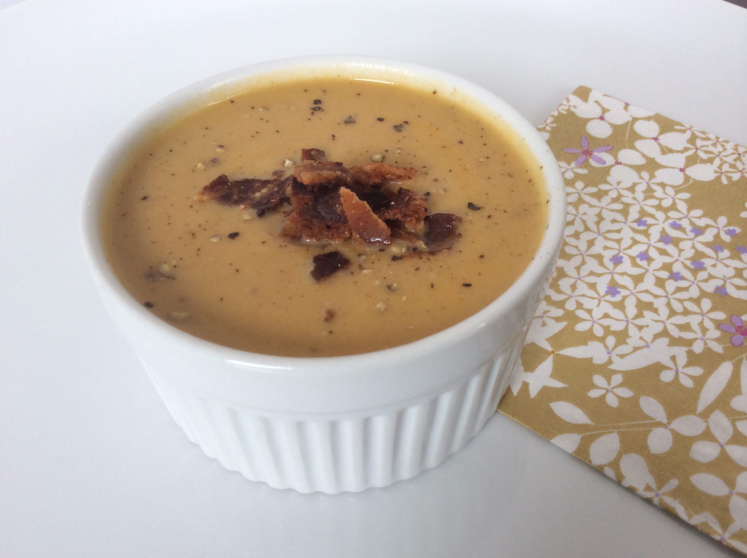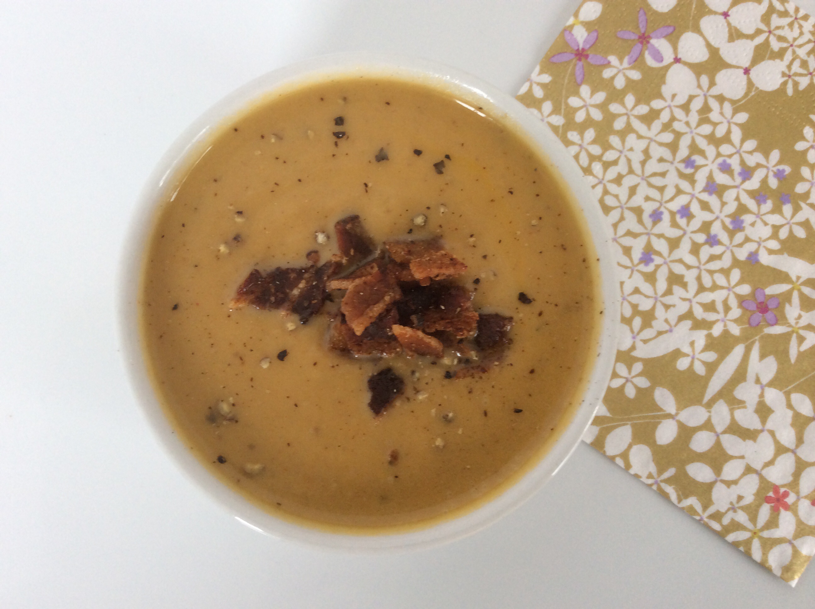 Then to the softened shredded vegetables and fruit, add allspice, cayenne, stock or water, and cream and let it bubble away for a quick 10 or 15 minutes. Once the squash is tender, whirr the immersion blender to carefully puree. Taste for seasonings – it should be a lovely mix of earthy sweet potato, fruity pear, a little smoky, with the perfect amount of kick from the cayenne. Garnish with the crunchy bacon and you will be one happy camper. Here’s to surprise victories while cleaning out the extras!