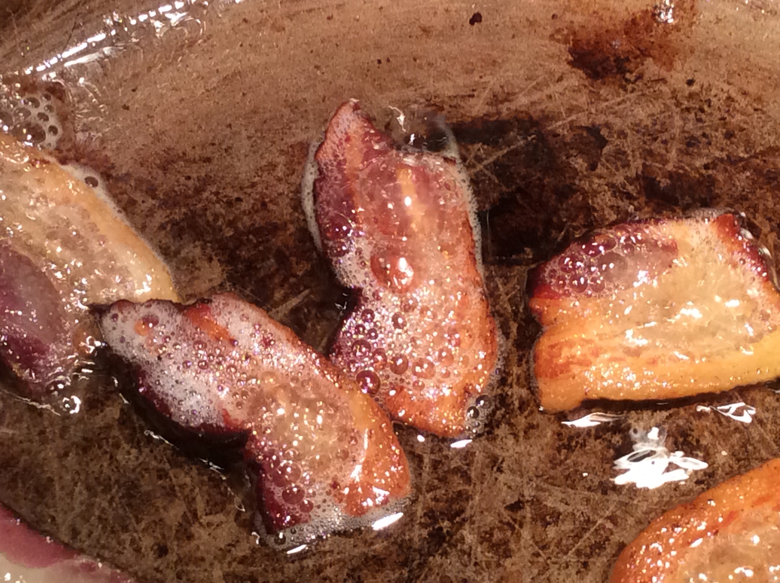 In this Mark Bittman recipe, he calls for browning the bacon, removing it to a paper towel lined plate and adding the shredded potatoes and pears to the salty hot grease…yes, an excellent start…